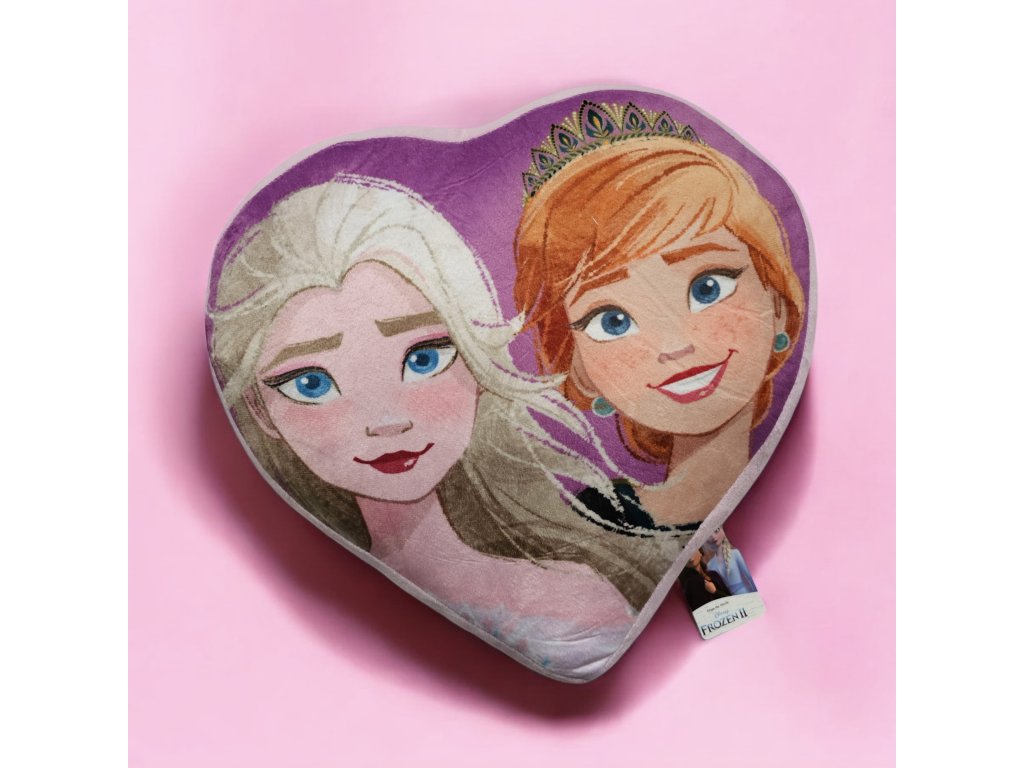 Měkoučký polštář ve tvaru srdce s motivem Elsy a Anny z Ledového království je krásným doplňkem do dětského pokoje.
