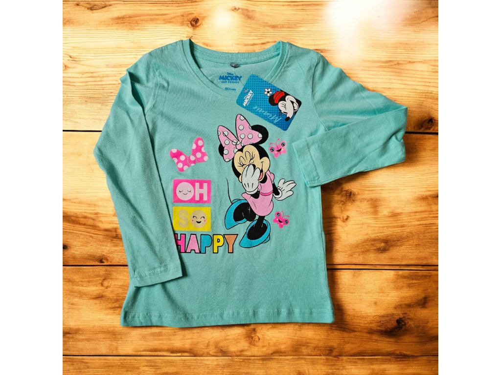 Pohodlné tričko v jemné tyrkysové barvě zdobí veselý potisk Minnie v růžových šatičkách s typickou puntíkovanou mašlí. Barevný nápis „OH SO HAPPY“ dodává tričku hravý vzhled, zatímco roztomilé detaily jako motýlci a mašličky podtrhují jeho kouzlo. Díky měkkému a příjemnému materiálu se hodí na celodenní nošení doma i venku.