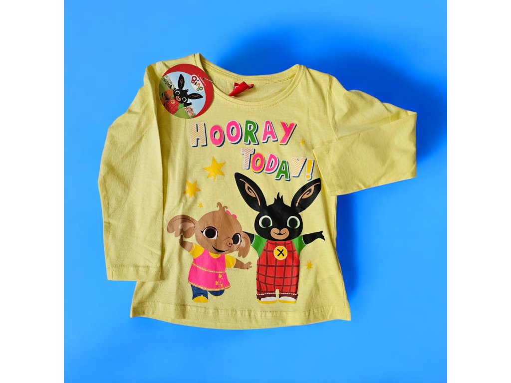 Světle žluté tričko s dlouhým rukávem přináší radostný design s veselými postavičkami ze seriálu Bing a barevným nápisem „Hooray Today!“, který dodává hravý vzhled. Díky měkkému materiálu a pohodlnému střihu je ideální na celodenní nošení – do školky, na výlety i na domácí pohodu.