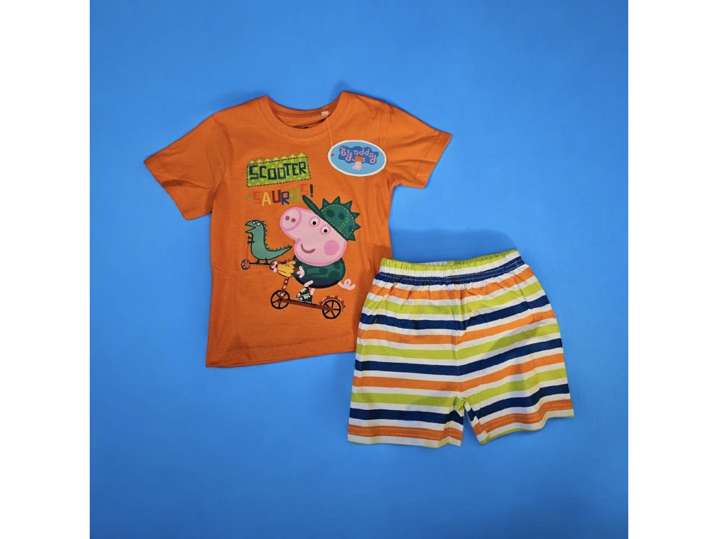• Oranžové tričko s krátkým rukávem – Na přední straně je barevný potisk Peppy, která jede na kole a drží v ruce dinosaura. Tričko je vyrobeno z lehkého a prodyšného materiálu, ideálního na horké letní noci.
