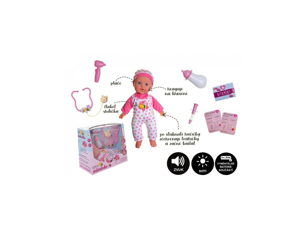 Nemocné miminko, které potřebuje pomoc od malých maminek či budoucích lékařek. K tomu jsou potřeba zdravotnické potřeby, které sada obsahuje. Panenka má měkké tělo a je se zvukem a světlem. Po stisknutí ručičky jí zčervenají tvářičky a začne kašlat. Přilož stetoskop na srdíčko a uslyšíš jeho tlukot. Po injekci začne miminko plakat. Dej miminku lahvičku do pusinky a poslouchej, jak pije. Uzdrav svoje miminko. Balení obsahuje stetoskop, injekční stříkačku, kukátko do uší, lahvičku, krabičku s nápisem VITAMÍNY a kartu pacienta. Panenka je velikosti 36 cm. Baterie 3x AG13 jsou součástí balení a slouží pouze pro předváděcí účely, doporučujeme baterie vyměnit za nové. Rozměry balení 37 x 31 x 17 cm Vhodné pro děti od 3 let