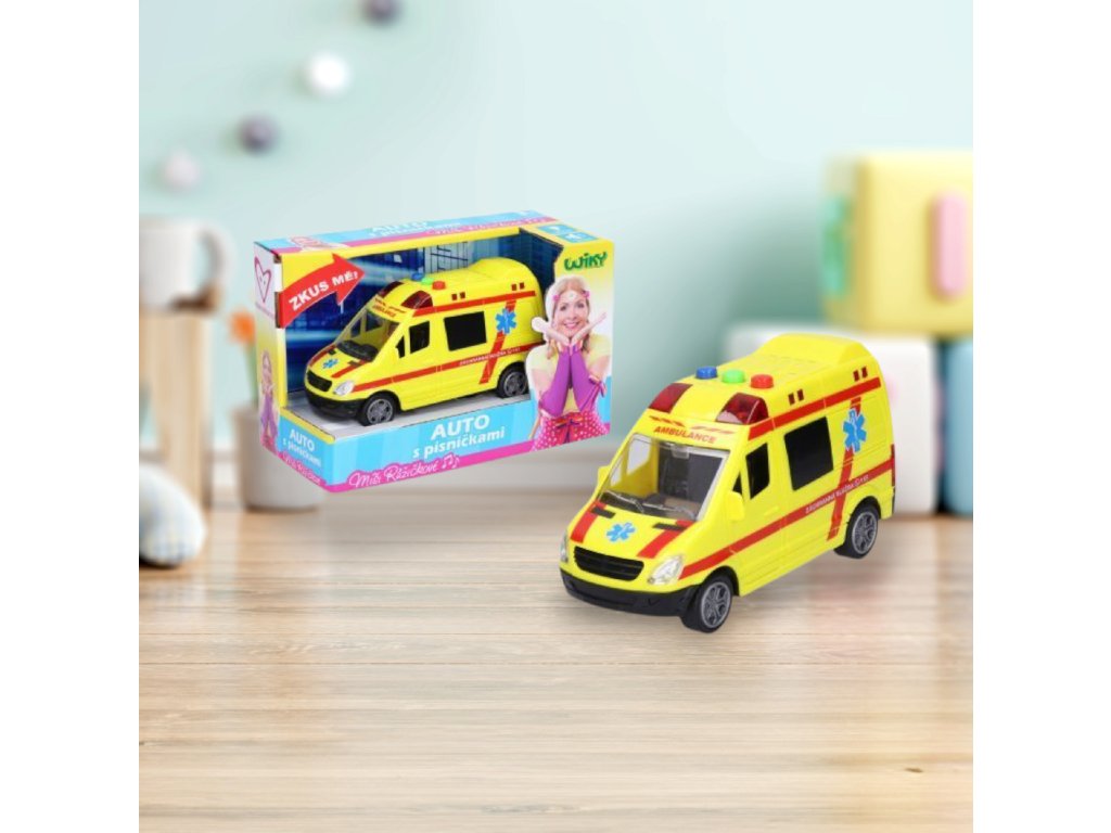 Světelné a zvukové efekty, tlačítky na střeše auta 3 písníčky Míši Růžičkové - Sanitka, Policejní, Popeláři. 3xAG13 baterie součástí.